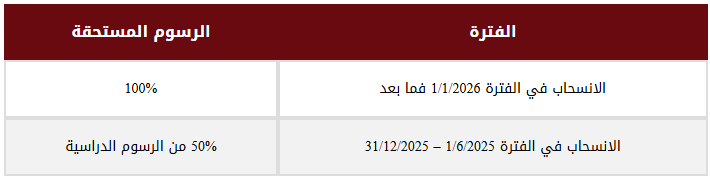 في حال الانسحاب، على ولي الأمر دفع جميع الرسوم المستحقة، كما يلي: